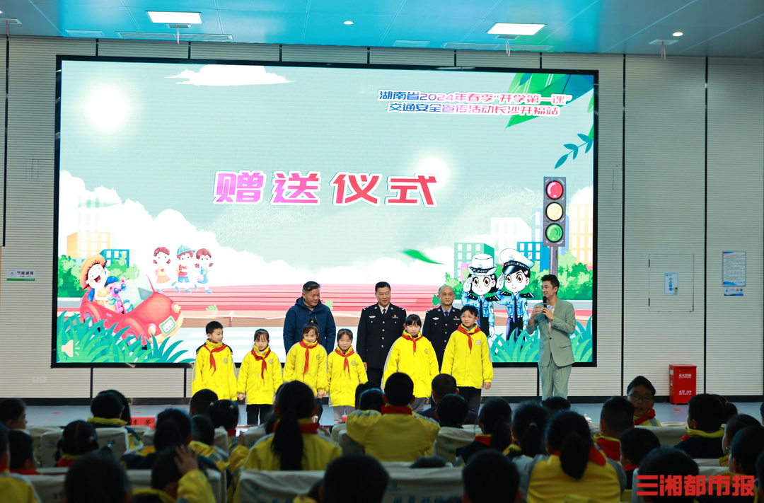 2月29日,长沙市开福区教育局、开福交警大队、清水塘江湾小学共同承办了湖南省2024年春季“开学第一课”交通安全宣传活动长沙开福站启动仪式。清水塘江湾小学5000名师生通过现场和教室电视直播进行观看学习。