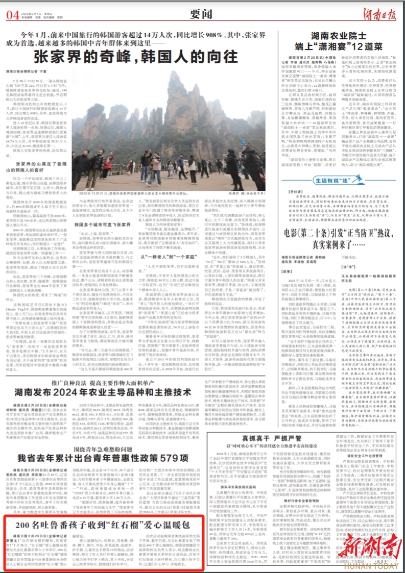 湖南日报2月29日讯(全媒体记者 廖慧文)“这件新衣服好暖和,我很喜欢!”2月28日,“红石榴”爱心温暖包捐赠仪式在吐鲁番市第六小学举行,200名“红石榴班”的孩子收到由“红石榴”湖南援疆公益专项基金与吐鲁番新的社会阶层人士联合会共同发放的“红石榴”爱心温暖包。