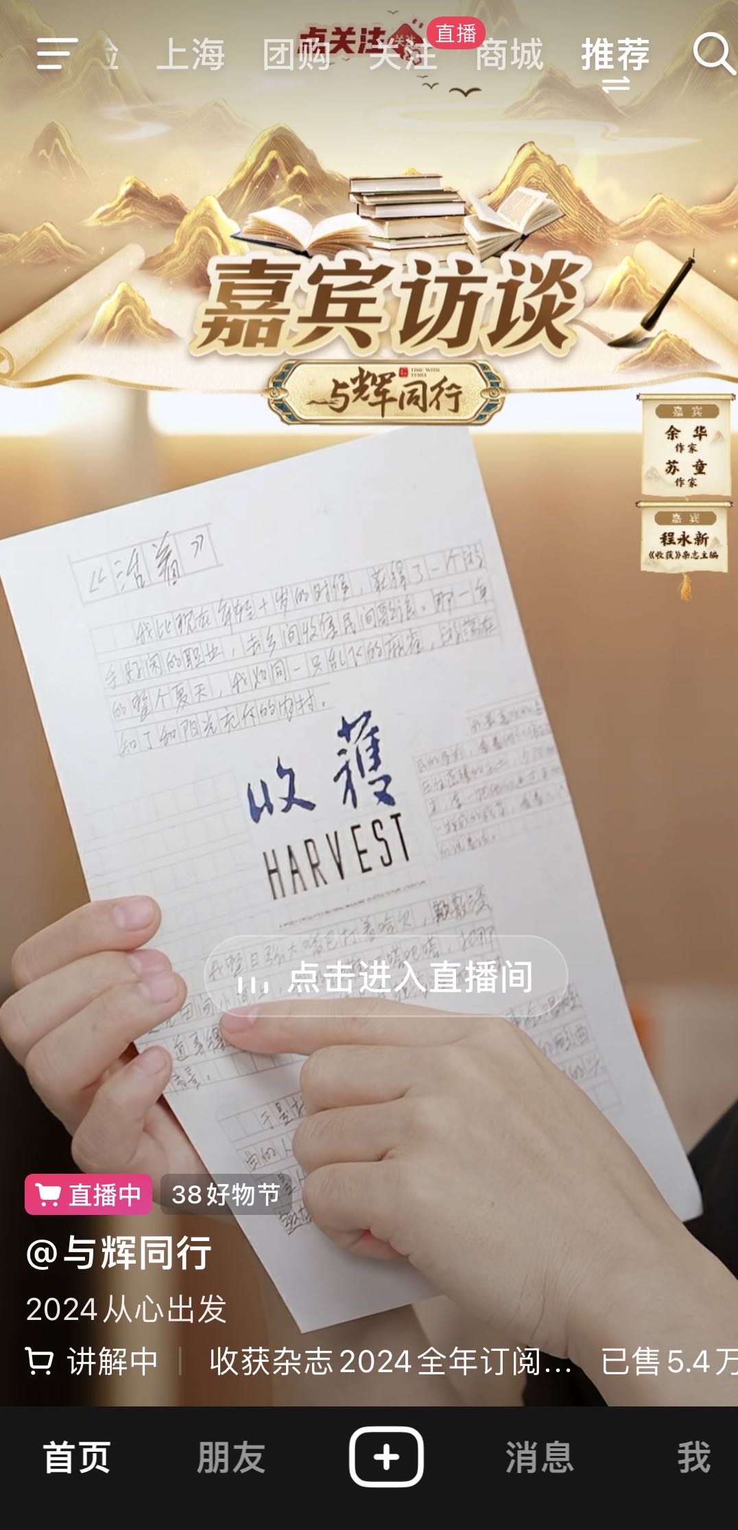 2月28日晚上十点半,由余华、苏童携手董宇辉的《收获》专场直播落下帷幕。原定1个小时的直播由于气氛热烈“拖堂”到2.5小时,期间获得1.7亿个赞,最高实时在线超48万人。截至次日零点,2024年《收获》全年杂志与2024年《收获长篇小说》在4个小时内分别售出7.32万套和1.5万套,成交金额1468万。而数据,还在不断上涨着。