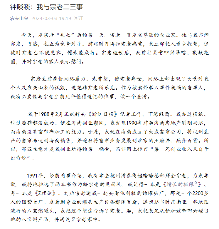 近日,娃哈哈集团创始人宗庆后因病逝世,引发各界缅怀。令人始料未及的是,有自媒体发文称,农夫山泉与其有"宿怨",以及"农夫山泉创始人钟睒睒第一笔创业收入来自娃哈哈""因冲货被开除"等。3月3日晚,农夫山泉高层密集回应,称传言不实。