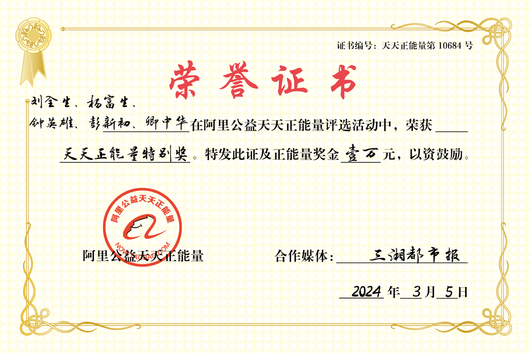 3月5日,三湘都市报联合阿里公益天天正能量为刘全生等5人颁发天天正能量特别奖,并奖励一万元,为他们的大义、为这份感恩点赞。