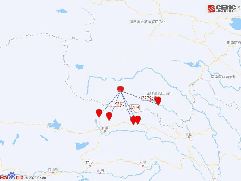 据地震人口热力图数据,震中周边属于高原无人区,目前也暂未收到震感反馈。此次震中距离最近的西藏聂荣县城177公里、距青海杂多县城227公里,震中5公里范围内平均海拔约4809米。