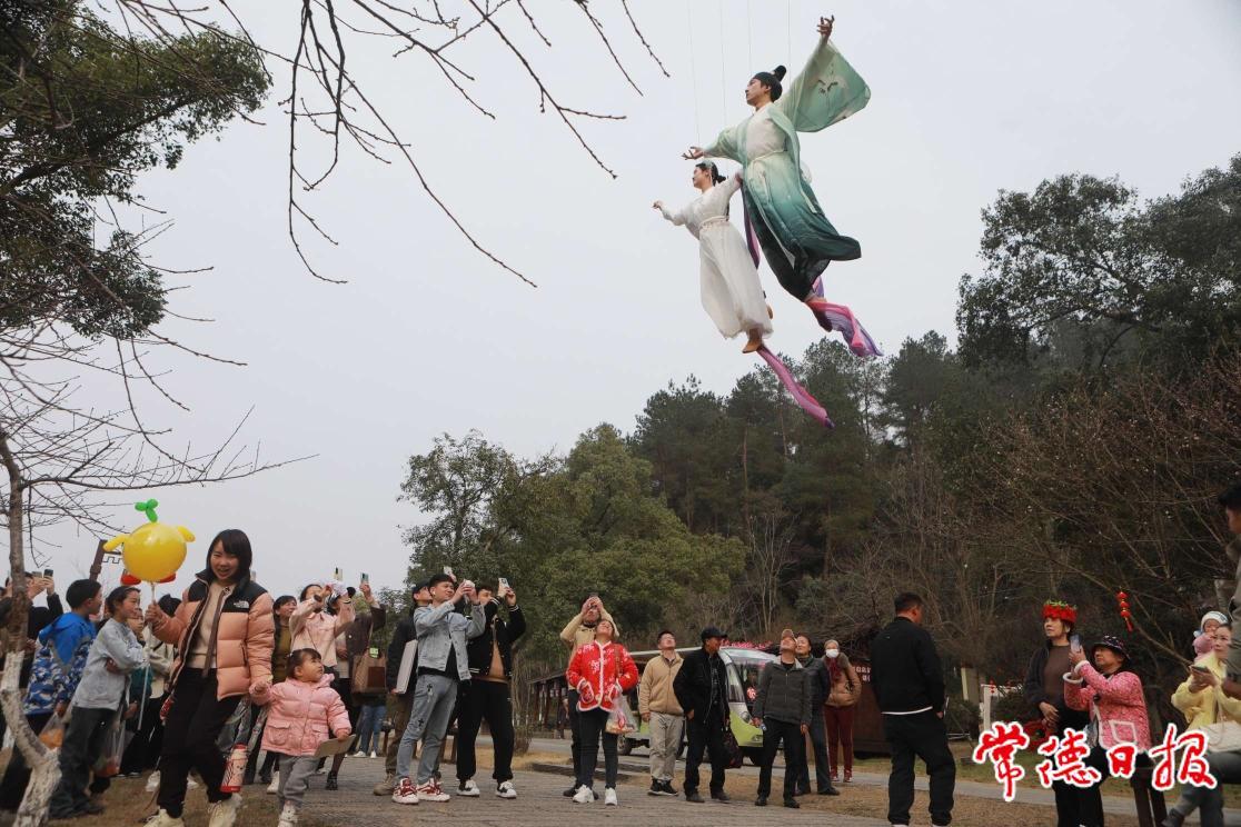 3月8日,常德桃花源景区一场梦回千年的仙境之旅正式开启,游客们在景区内看花神争霸、观蟠桃盛会、听国乐戏曲。当日,桃花源核心景区接待游客破万人,其中,国内外旅游团队近5000人。《桃花源记》山水实景演出3场全满,接待游客1500人。