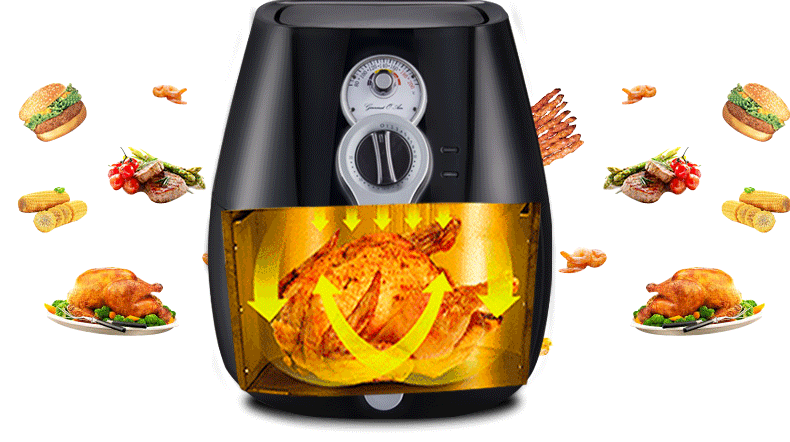 1、空气炸锅上方的加热器产生高温热风,通过对流的方式到达食物表面,再通过热传导烹熟食物内部。