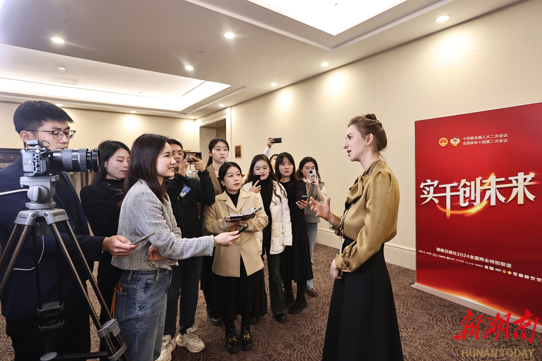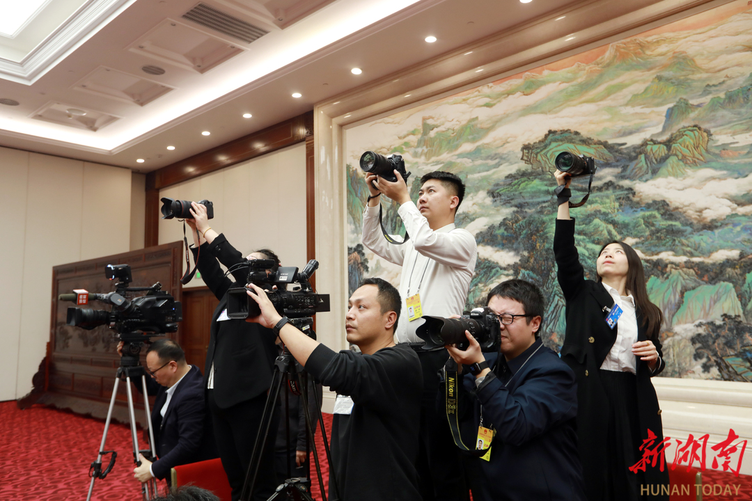 湖南日报全媒体记者团队在湖南代表团开放日现场采访。