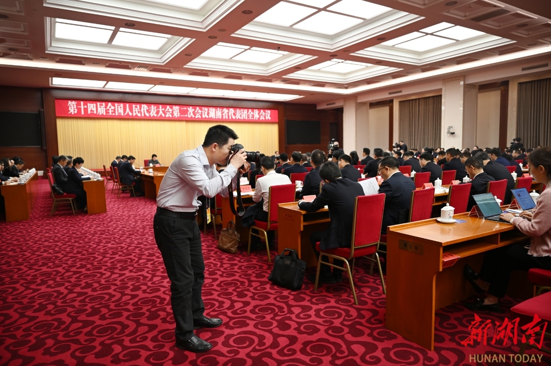 湖南日报全媒体记者刘尚文在湖南代表团全体会议现场采访。