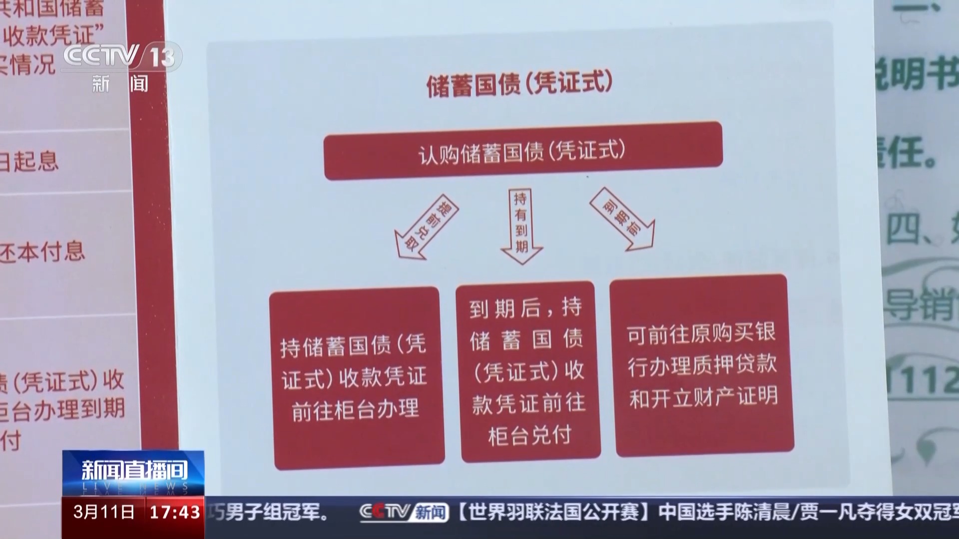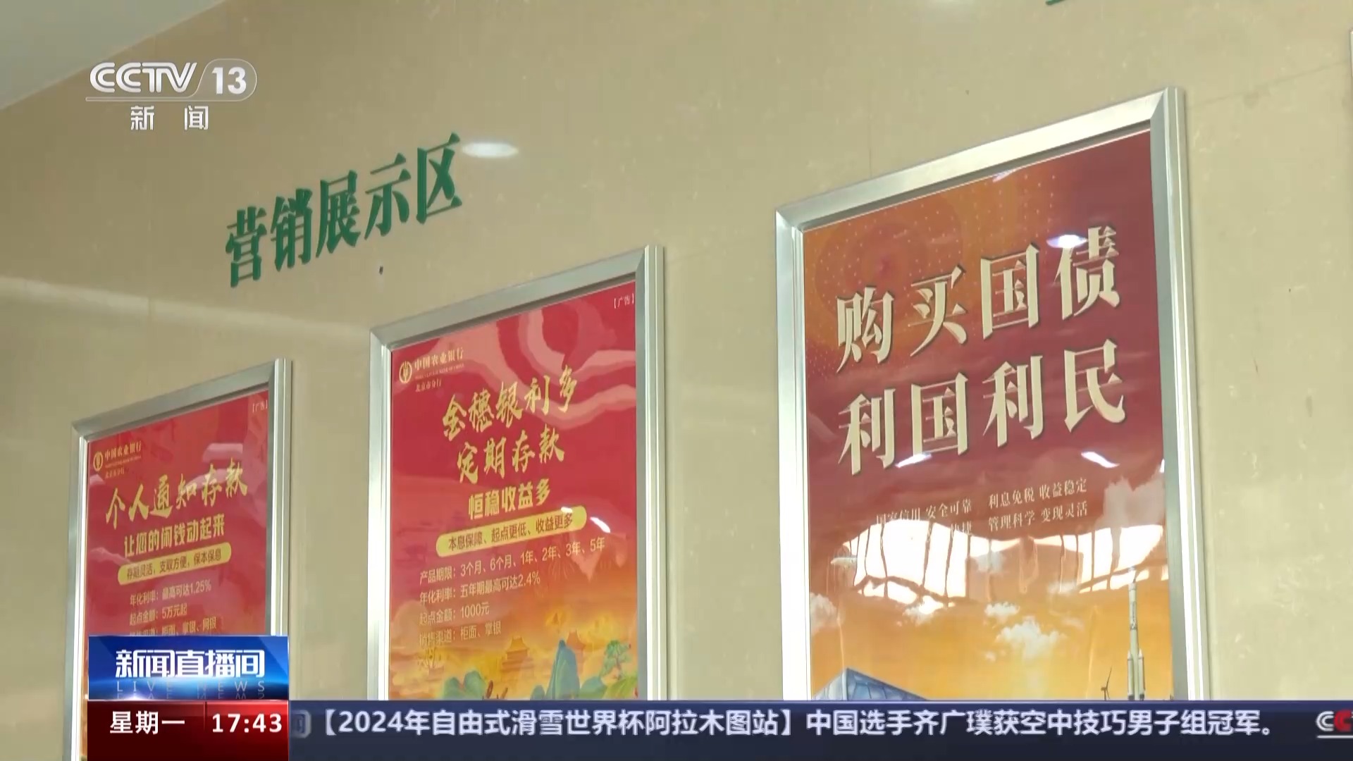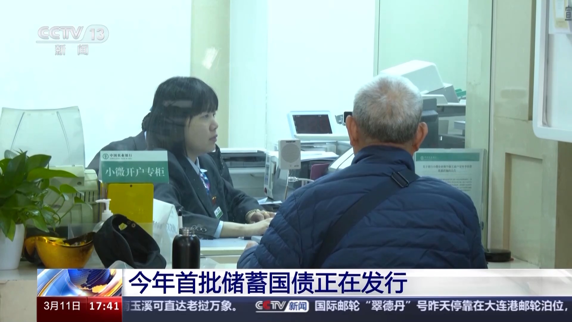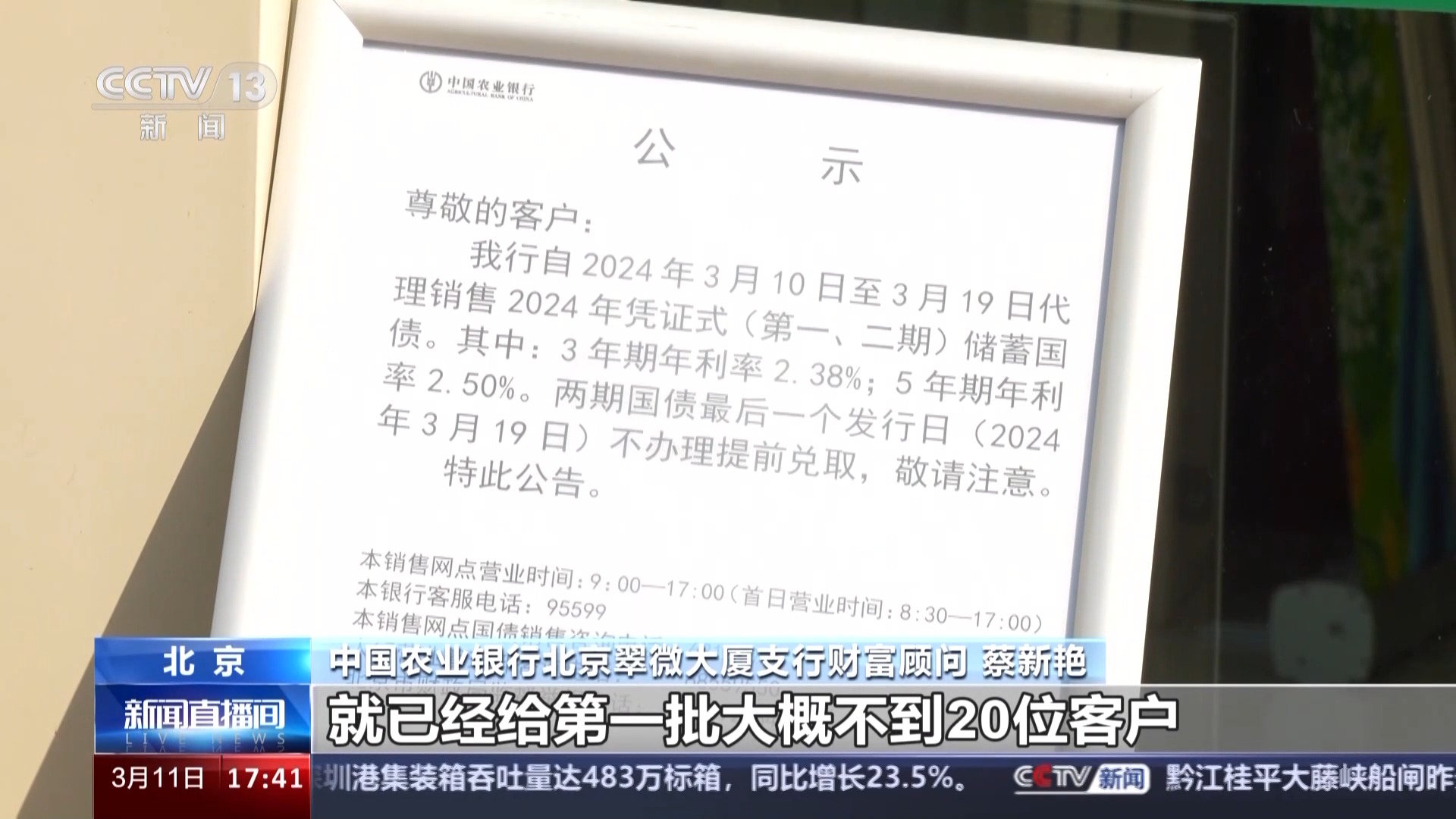 总台央视记者 王楠:这里是北京的一个银行网点,在这里我们看到,3月6日网点就已经摆放了财政部公告,根据公告,3月10日到19日将发行今年第一期和第二期凭证式国债,这也是今年首次发行储蓄国债。