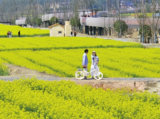 位于长沙近郊的福临镇,盛放的万亩油菜花海比市区的油菜花呈现得更为纯粹热烈。碧蓝的天空下,万亩油菜花点缀在田埂山间,漫步在景观步道,在路边木亭休憩打卡,仿佛置身于一幅轻快明亮的田园画卷。上周日才在福临镇油菜花海赏玩回来的周女士表示,“虽然有点远,但是我觉得很值得去,福临镇的油菜花开得很好,我们拍了很多照片”。
