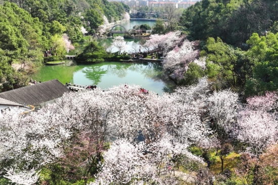 长沙望月公园是一座汉文化主题公园,园内栽有山樱花近300株,系中国本土樱花品种,分布在公园铜盆湖湖畔、玉璧广场、汉乐区附近,现在已经迎来最佳观赏期。