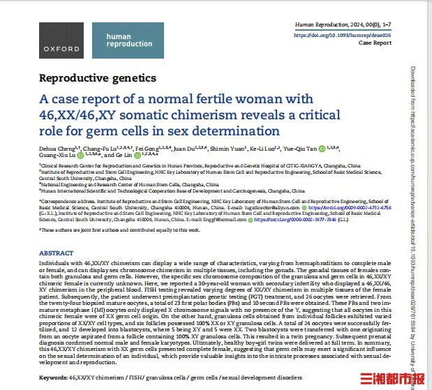 三湘都市报·新湖南客户端3月12日讯(文/视频 全媒体记者 李琪 通讯员 袁诗敏)3月12日,记者从中信湘雅生殖与遗传专科医院获悉,中南大学生殖与干细胞研究所/中信湘雅生殖与遗传专科医院的林戈和卢光琇团队提出了一项引人注目的新理论,涉及人类性别决定的关键因素,即人类性别可能是由原始生殖细胞的性染色体组成决定。这一重大发现近日发表在国际经典人类生殖杂志《Human Reproduction》上。