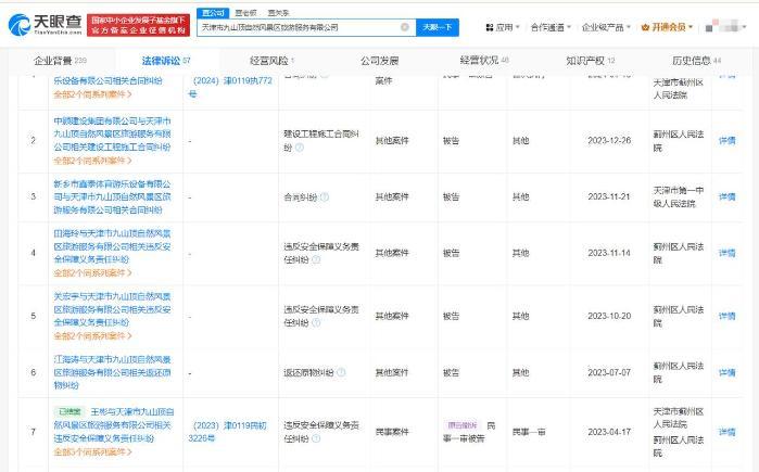 此外,因景区安全带风险隐患而被曝光的天津市九山顶自然风景区,天眼查法律诉讼信息显示,2023年以来,相关公司多次因“违反安全保障义务责任”成为司法案件被告。