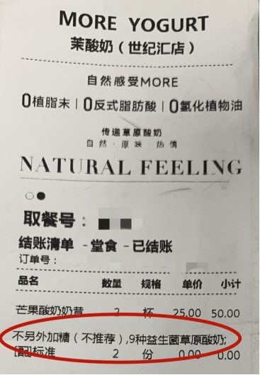 除了脂肪,可能消费者还比较在意芒果酸奶奶昔“回味甘甜”是因为加了蔗糖和麦芽糖,特别要说明本次测试购买的是“不另加糖”的芒果酸奶奶昔。