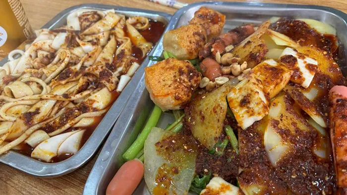 除了各式土豆粉之外,切得薄薄的一抿就化的土豆片,用土豆丝团成球油炸的洋芋丸子,吸满了浓浓的红汤、入口爆汁,也是甘肃麻辣烫里必不可少的存在。