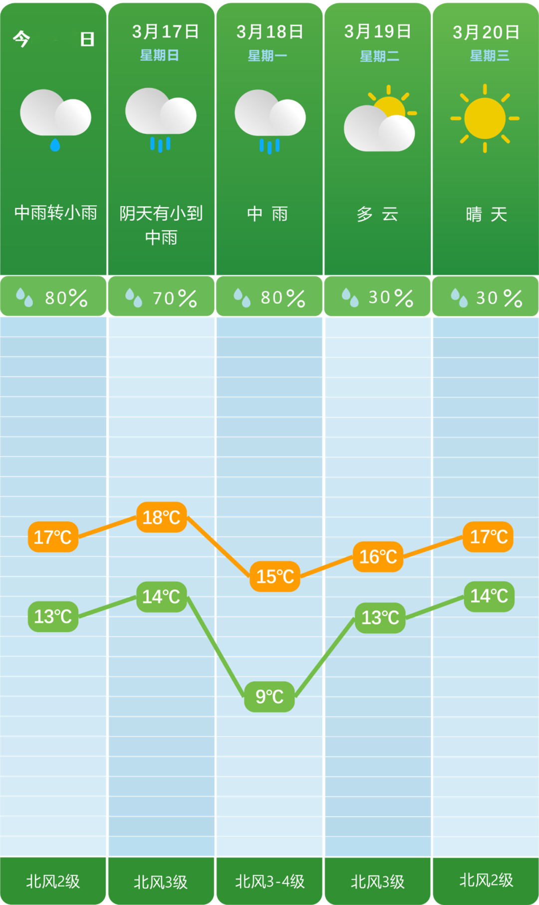 明天,湘中以北阴天有小到中等阵雨或雷阵雨,其中湘西州北部、怀化北部、张家界南部局地有大雨,其他地区阴天间多云,大部分地区有阵雨或雷阵雨;湘南南风2~3级,其他地区北风2~3级;最低气温:湘西北12~14℃,湘南16~18℃,其他地区14~16℃;最高气温:湘南22~24℃,其他地区17~19℃。