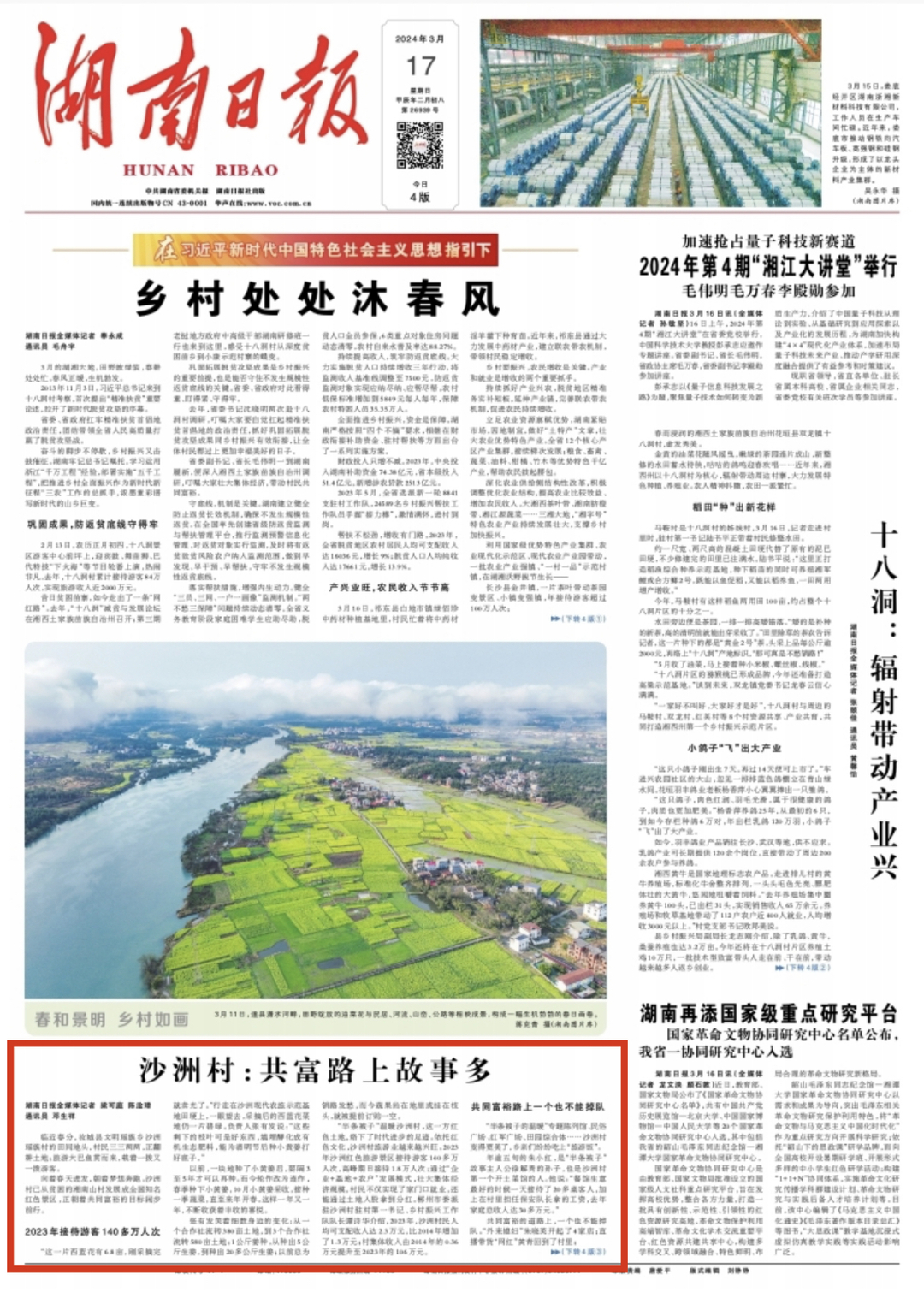 “半条被子”温暖沙洲村,这一方红色土地,烙下了时代进步的足迹。依托红色文化,沙洲村旅游业越来越兴旺。2023年沙洲红色旅游景区接待游客140多万人次,高峰期日接待1.8万人次;通过“企业+基地+农户”发展模式,壮大集体经济规模,村民不仅实现了家门口就业,还能通过土地入股拿到分红。郴州市委派驻沙洲村驻村第一书记、乡村振兴工作队队长谭诗华介绍,2023年,沙洲村民人均可支配收入达2.3万元,比2014年增加了1.3万元;村集体收入由2014年的0.36万元提升至2023年的106万元。