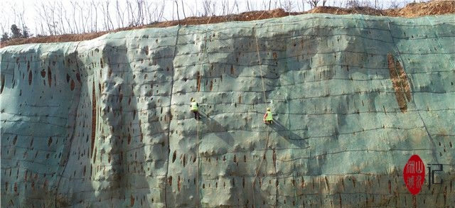70米高的坑壁上,“矿坑美容师”依靠保险绳平衡身体,在岩石上播种绿色。陈飞 摄
