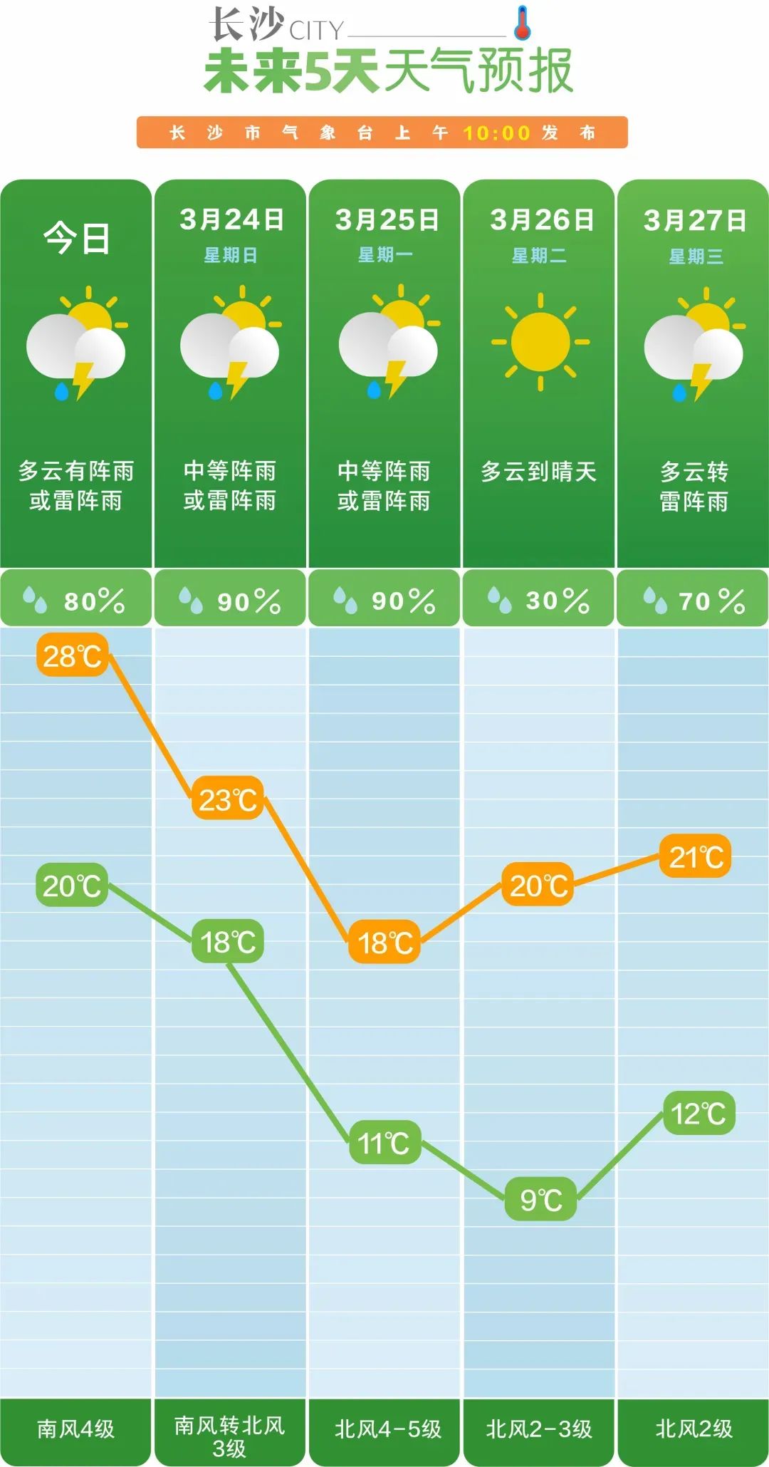 25日,白天随着冷空气的持续南下,天气系统有所南移,湘中及以南地区有小到中雨,局地大到暴雨,并伴有短时强降水、雷暴等强对流天气;25日晚开始,天气系统进一步东移南压,从湖南省过境,全省天气转多云到晴天。