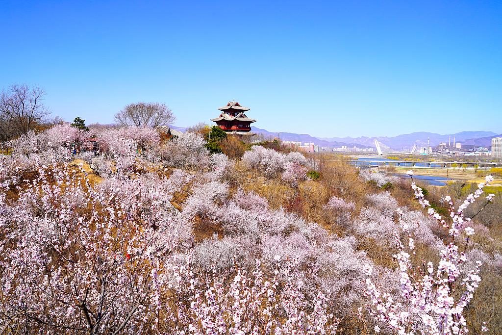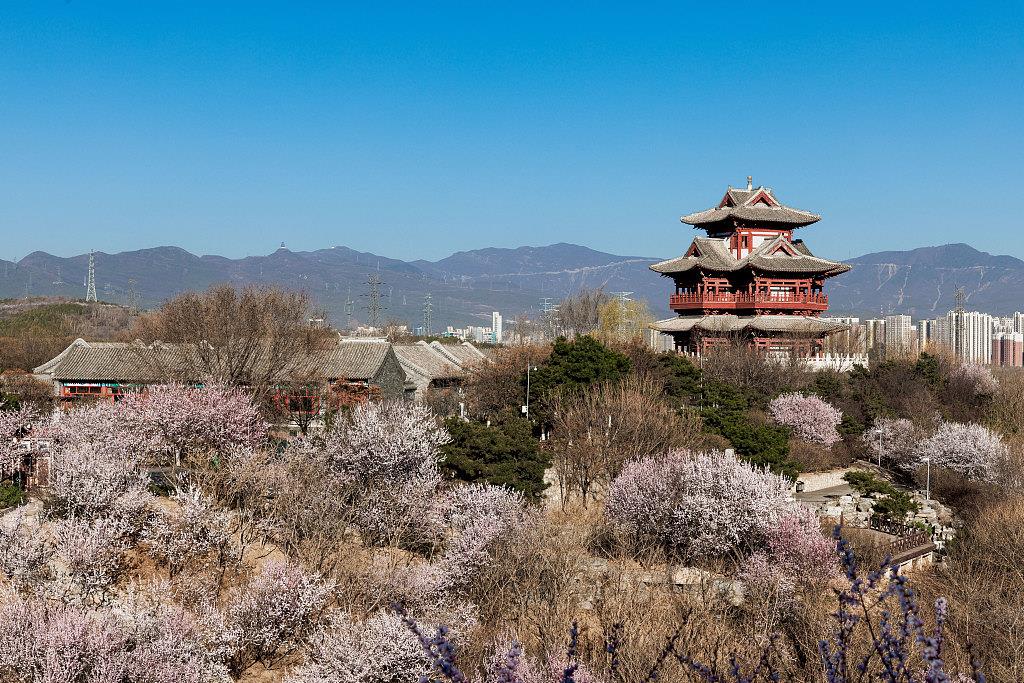 3月的北京,迎来了大片的山桃花。园博园里团团簇簇的花朵沿着山坡晕染开来,为春日“上妆”。