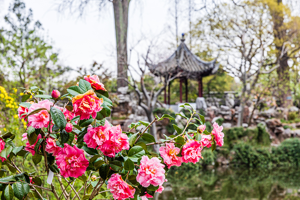 江苏苏州留园内,茶树花开正艳,看红色山茶花如何点缀着粉墙黛瓦。