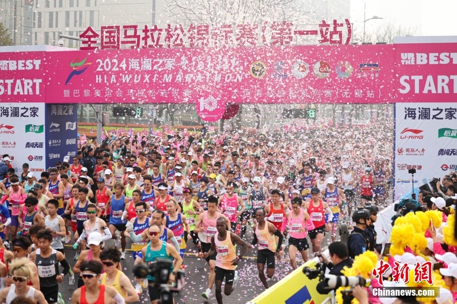 3月24日,2024无锡马拉松在江苏无锡举行,何杰以2:06:57的成绩作为国内第一名通过终点,打破全国男子马拉松纪录,中国马拉松打破207进入206时代。图为比赛现场。