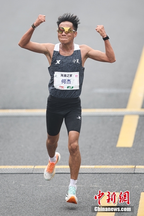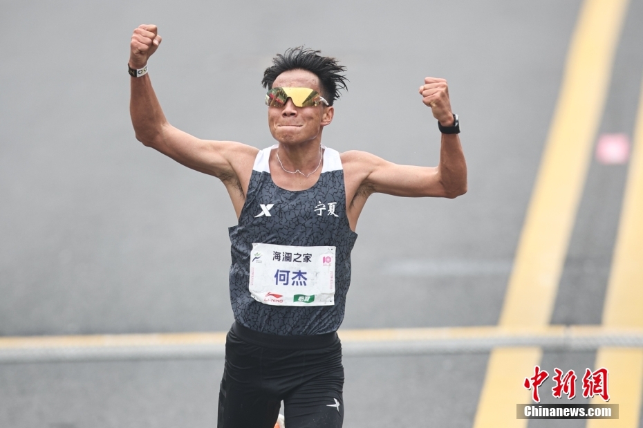 3月24日,2024无锡马拉松在江苏无锡举行,何杰以2:06:57的成绩作为国内第一名通过终点,打破全国男子马拉松纪录,中国马拉松打破207进入206时代。图为何杰冲过终点线。
