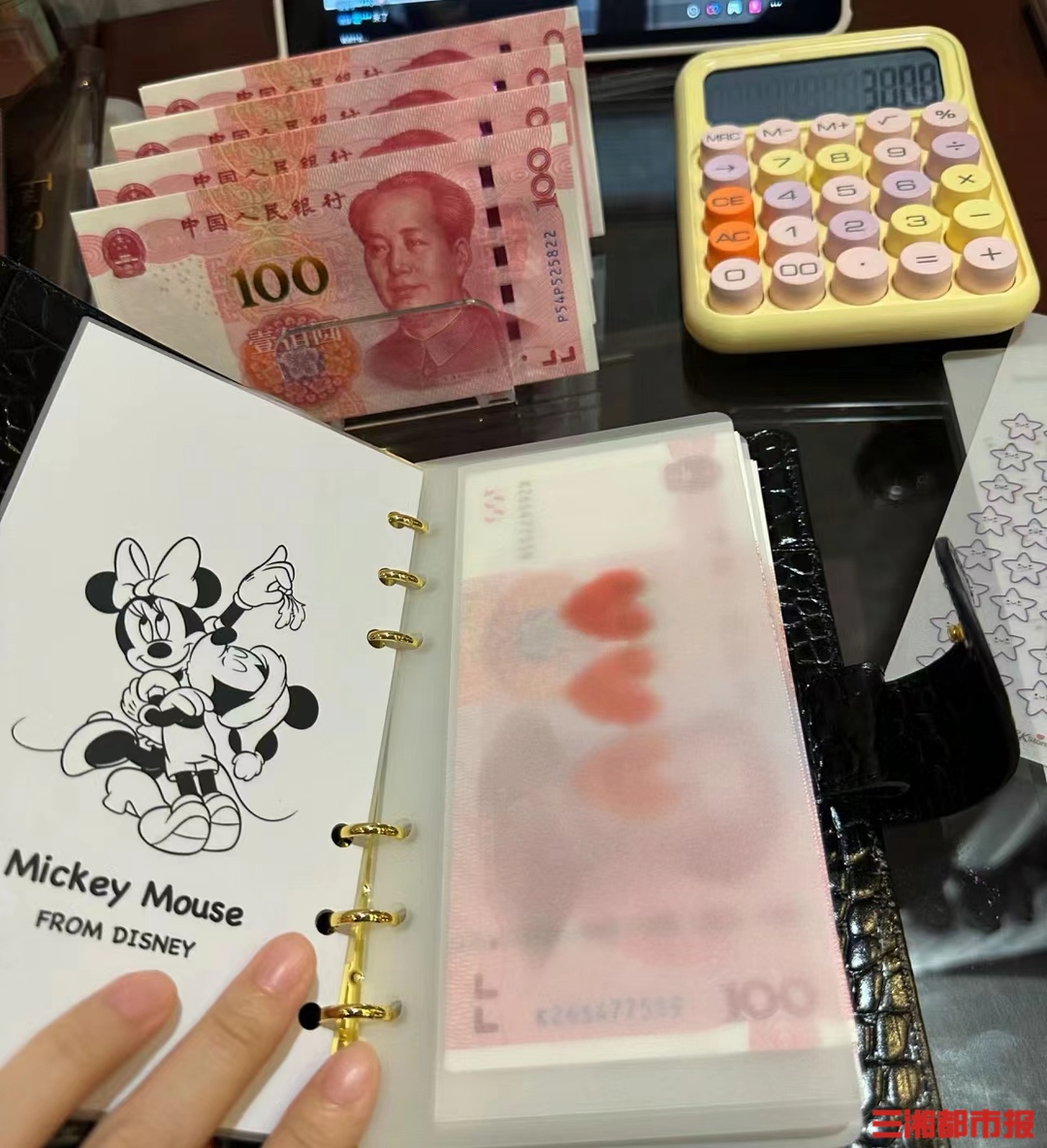“每个月发了工资后,先根据以往的消费情况来设置下当月的预算,然后照着预算金额取出相应的现金,取出的现金可以分类装进收纳袋里,花了钱就记下账。”同时,“掌上明猪”展示了自己淘到的可放现金的记账本,百元钞票整齐地被放在每个独立密封收纳袋内,“尽量使用现金,让花钱有痛感。每一笔钱的去向都清清楚楚,关键是用现金真的可以攒钱。”