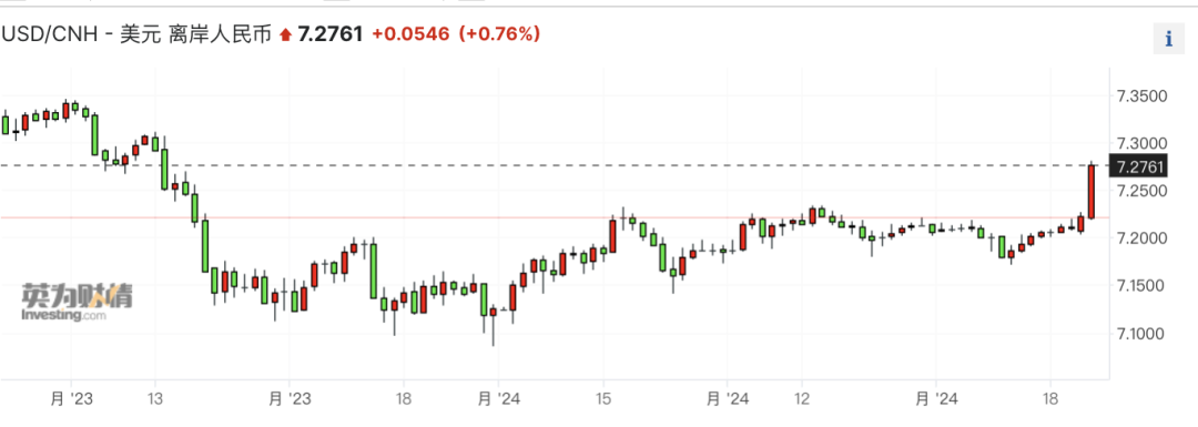 事实上,除了对地缘政治扰动的反应,人民币波动也来源于交易员对中间价的过度关注。巴克莱中国利率、外汇策略师张蒙对记者表示:“初始触发人民币贬值的因素应该是隔夜美元对所有货币的强势走势。此外,人民币中间价也存在一定影响,市场正在重新调整预期,因为中国央行本可以将中间价保持在7.099左右的水平(就和过去一段时间一样),但22日的中间价为7.1004,接着就出现在岸汇率跌破7.2,触发了一些对冲基金的止损,可能是和期权有关。”
