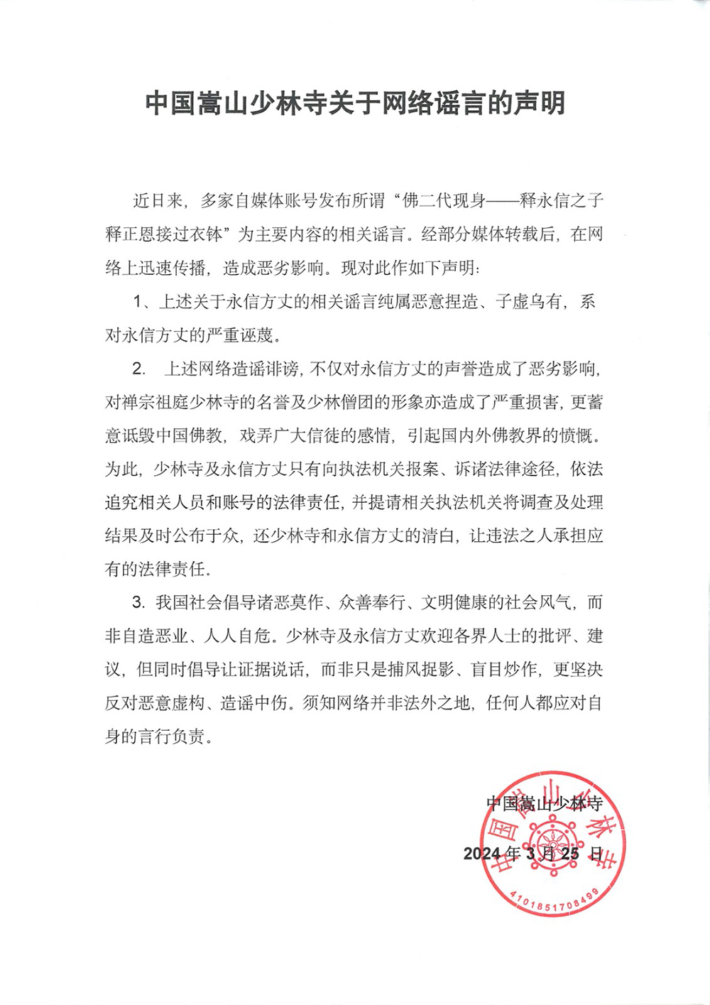 少林寺辟谣“释永信之子释正恩接过衣钵”:恶意捏造,已报案