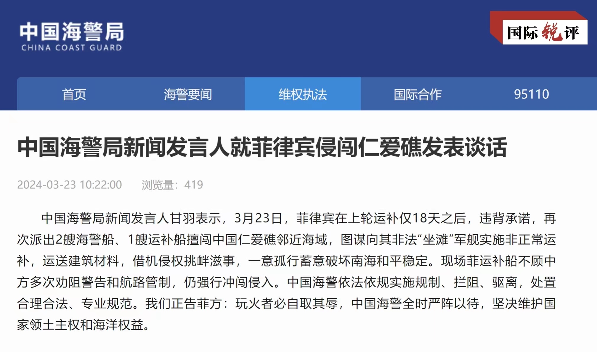 此外,在这两次非法侵闯之间,菲律宾还于3月21日出动多达34人的“大部队”,无视中方警告劝阻,非法登上中国的铁线礁活动。在中方海警的依法处置下,菲律宾企图霸占铁线礁的阴谋未能得逞。