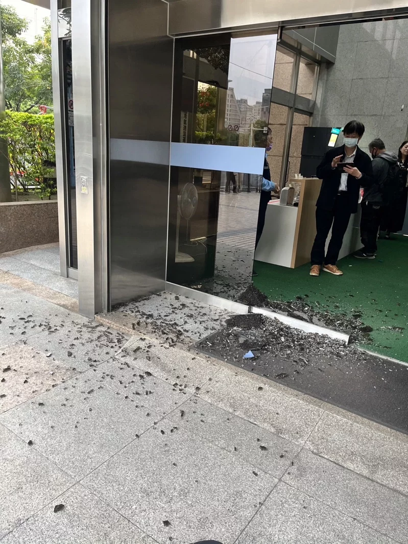 图为28日上午,位于台北市延平南路的“数位发展部”大楼遭枪击,玻璃大门碎裂。图自台湾《联合报》
