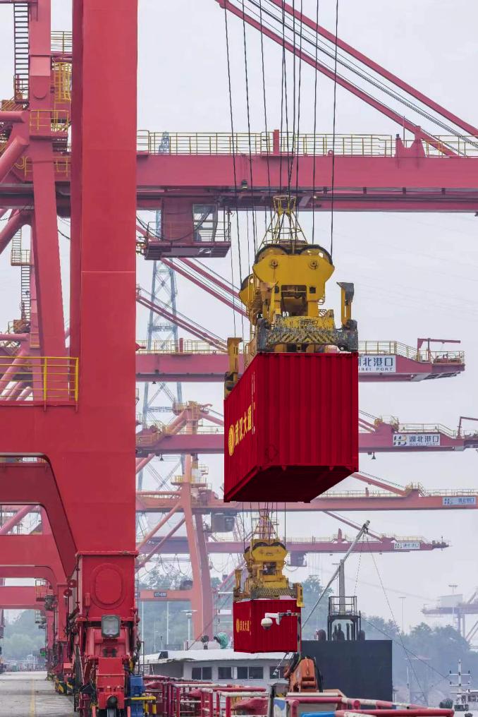 这是湖北港口集团阳逻核心港区正在进行装卸作业。近日,“武汉-日韩”汉亚直航集装箱班轮营运繁忙,运输货物包括汽车及零部件、无纺布、家电、农副产品等进出口商品,加快推进长江中游航运中心建设。(湖北港口集团供图)