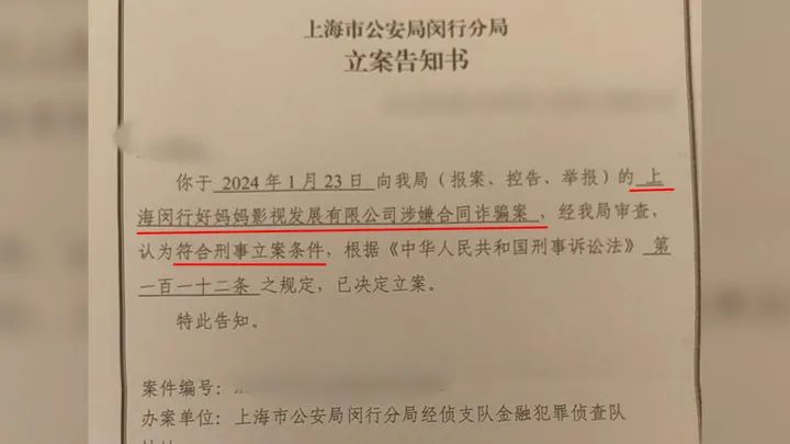 3月21日,上海市公安局闵行分局向王玲寄出立案告知书,文件内容显示:你于2024年1月23日向我局(报案、控告、举报)的上海闵行好妈妈影视发展有限公司涉嫌合同诈骗案,经我局审查,认为符合刑事立案条件,根据《中华人民共和国刑事诉讼法》第一百一十二条之规定,已决定立案。特此告知。