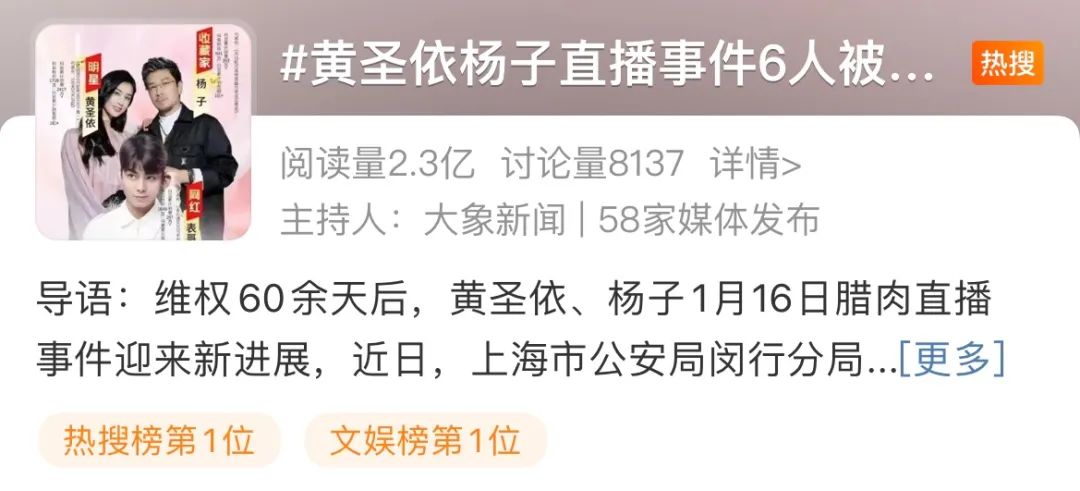黄圣依、杨子“1·16腊肉直播事件迎来最新进展,被骗商家王玲维权60余天,收到了上海市公安局闵行分局寄来的立案告知书,又等来了好妈妈影视发展有限公司的六名工作人员被刑事拘留的消息。3月29日,相关话题冲上微博热搜。