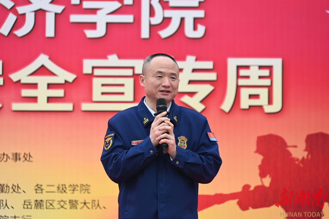 3月27日,湖南财政经济学院联合湘江新区咸嘉湖街道办事处举办的2024年校园安全宣传周活动启动仪式暨消防演练活动在学生活动广场举行。校长刘长庚宣布校园安全宣传周活动正式启动。副校长刘茂盛,校党委委员、宣传统战部部长文炳勋、相关职能部门负责人、1000余名师生代表和湘江新区交通运输局、岳麓区消防救援大队、岳麓区交警大队、咸嘉湖派出所、西大门社区、湖南银行财院支行等单位代表参加活动。