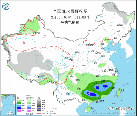 其中3月30日至31日,湖南中南部、江西中南部、福建、广西中北部、广东中东部等地有中到大雨,广西东北部、广东北部、江西南部、福建西部等局地有暴雨或大暴雨。