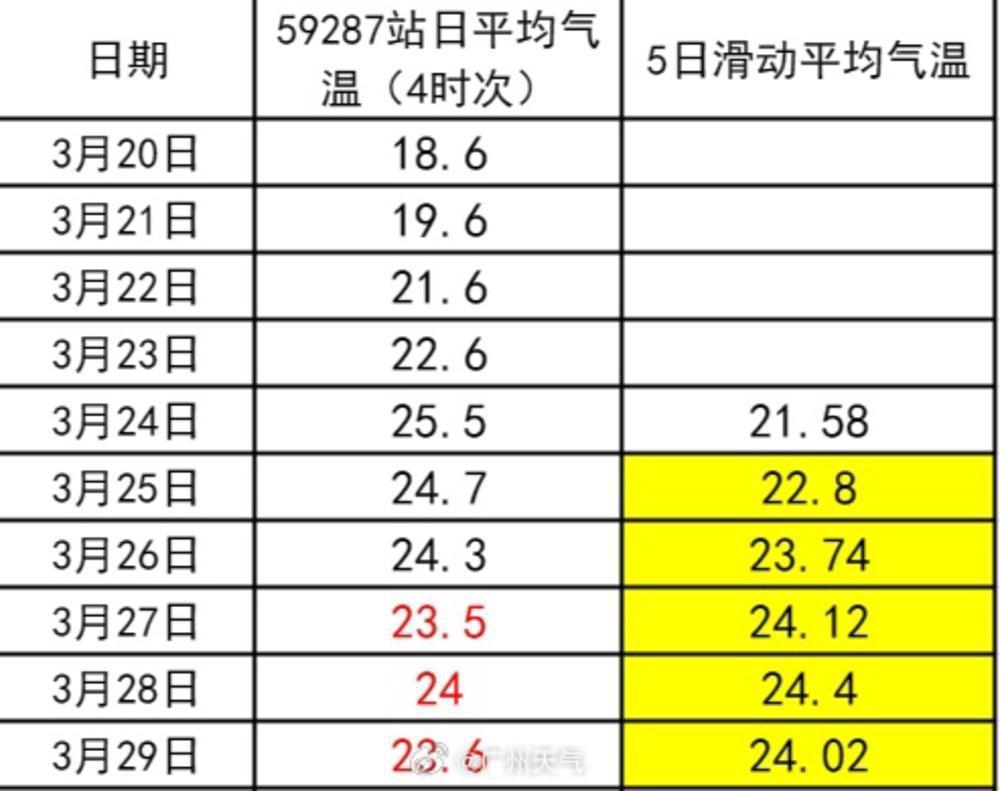 根据广州市气象部门监测,广州国家基本气象站在2024年3月23日录得日平均气温22.6℃,此后的3月24日至29日该站日平均气温均在22℃以上。