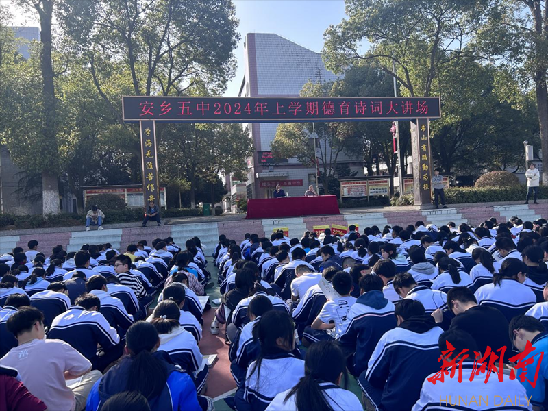 新湖南客户端3月30日讯(通讯员 谢思源)3月28日下午,安乡县第五中学组织高一、高二全体师生开展以唐诗宋词为主题的诗词教育活动,旨在通过诵读经典诗词,培养学生的家国情怀,传承中华诗词文化传统。