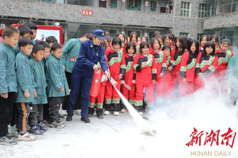 灭火演练,互动学。“嘀……”随着一声警报声,十八洞村小学的师生们弯着腰,弓着背,捂住口鼻,快速有序地撤离教室。现场模拟小学教室突发火灾,老师在发现火情后第一时间组织学生安全疏散。在湘西、湘潭、衡阳、邵阳等地,消防部门纷纷组织师生开展了疏散逃生演练,在演练结束后为师生讲解常见消防器材的使用方法和注意事项等,并邀请师生代表进行实际操作。在消防宣传员“手把手”指导、“面对面”教授的过程中,学生们按正确的步骤,用灭火器将燃起的火苗迅速扑灭,纷纷过了一把“消防瘾”。