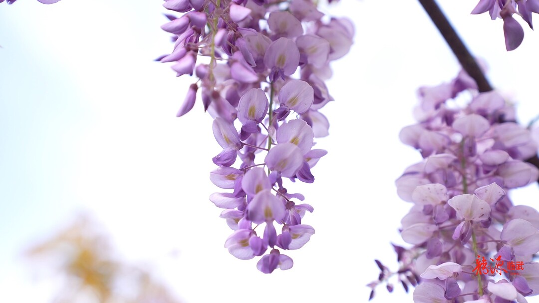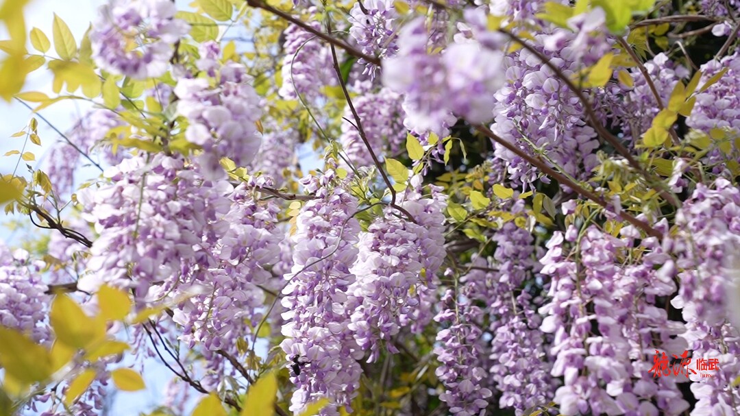 在临武县秦汉古道溱水关文化广场,串串紫藤花开正旺,低垂的花穗倾泻而下,层层叠叠,宛如树上流下了花的“瀑布”。