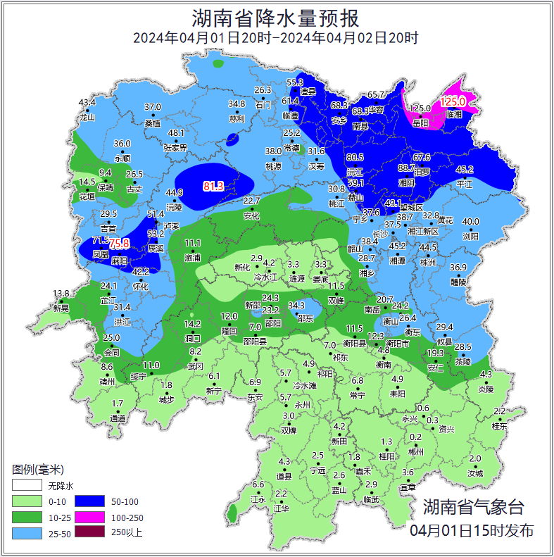 根据省气象局4月1日预报,省水利厅与省气象局联合会商得出如下结论:受降雨影响,1日20:00至2日20:00,岳阳市大部、长沙市北部等局地可能发生山洪灾害,常德市中部、益阳市中部等局地发生山洪灾害的可能性较大。