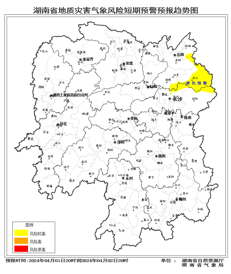根据地质灾害成灾规律和孕灾条件,结合4月1日短期气象预报情况,省自然资源厅与省气象局联合会商得出如下结论:自4月1日20:00至2日20:00,受降雨影响,湘东北部分区域发生突发性地质灾害风险较高(黄色预警)。