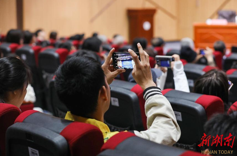 上午10点,湖南省古生物大讲坛第八期正式开始,讲坛由湖南省地质博物馆副馆长钟琦主持,湖南省自然资源厅矿产资源保护监督处副处长叶庆华致欢迎辞,彭善池研究员作了题为《湖南的‘金钉子’》的学术报告,湖南省地质博物馆馆长李倩、副馆长高少文、原湖南省地质研究所六位退休老地质专家与130余名现场观众一同认真听了报告。