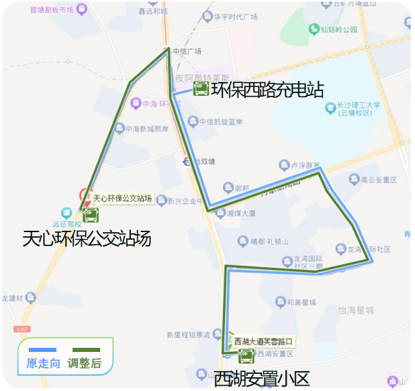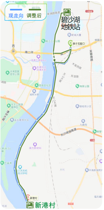 此外,原139路区间线(原猴子石路口至新港村)更名为35路,调整之后的首末站情况为:碧沙湖地铁站至新港村。上行情况是从碧沙湖地铁站发车,经南湖路隧道北辅道-湘江大道至猴子石大桥东北辅道口,(直行)湘江大道至新港村。下行情况是从新港村发车,经湘江大道-丽江路-天心大道-南二环北辅道-湘江大道-南湖路至碧沙湖地铁站。运营时间是6:30—18:00;票价是2元/人次。调整理由是填补湘江大道(南湖路-丽江路段)公交空白,并与轨道4号线碧沙湖地铁站接驳,满足南站社区、新天社区居民出行需求。