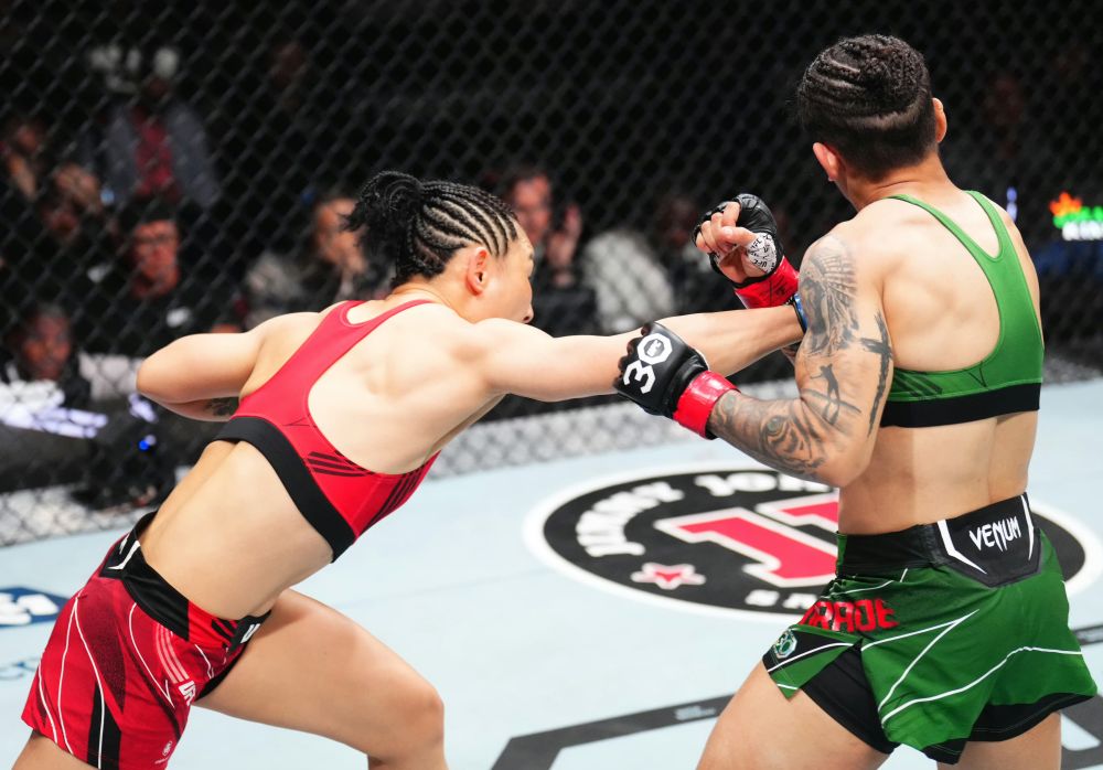 △闫晓楠(左)在2023年5月7日的UFC288比赛中对阵杰西卡·安德拉德。图片来自UFC