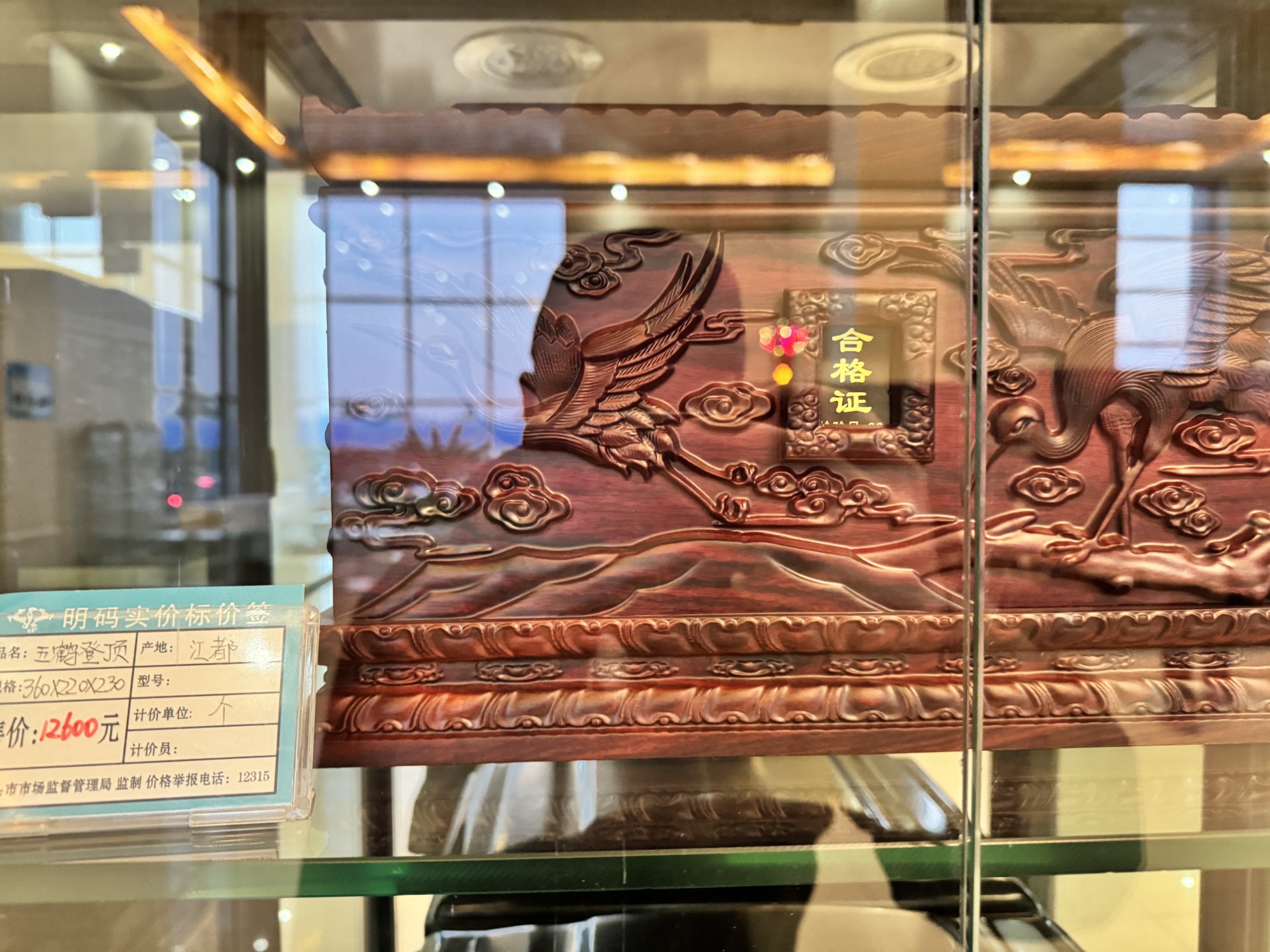 在业务大厅的殡葬用品超市,左右两侧有专门的骨灰盒展柜,按高中低档分区,多数骨灰盒的价格都在三千元以上,也有几款骨灰盒的价格超过了万元。