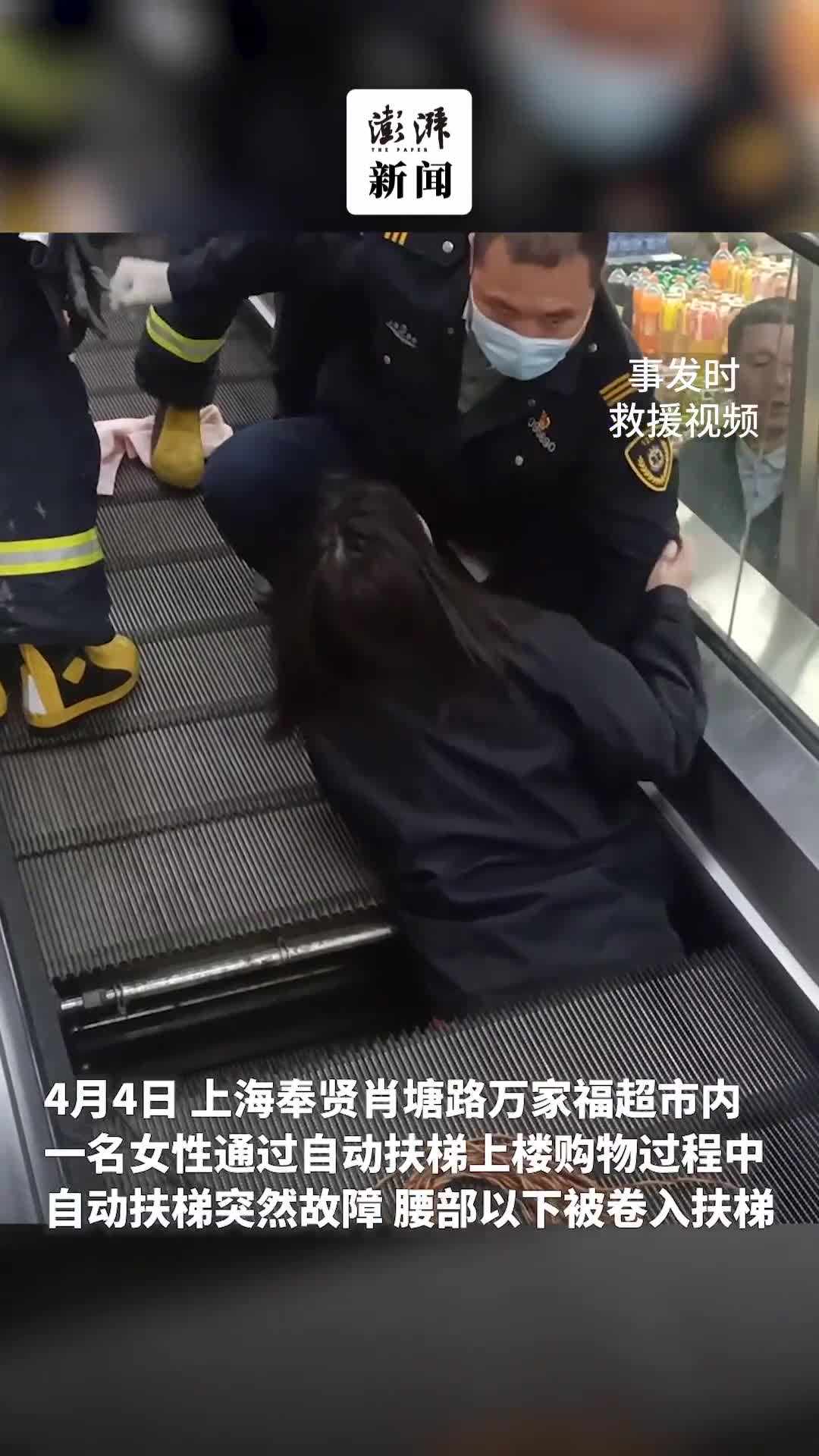 4月4日16时34分许,上海市奉贤区肖塘路万家福超市内,一名女性通过自动扶梯上楼购物过程中,自动扶梯突然故障,其腰部以下被扶梯“卷入”。