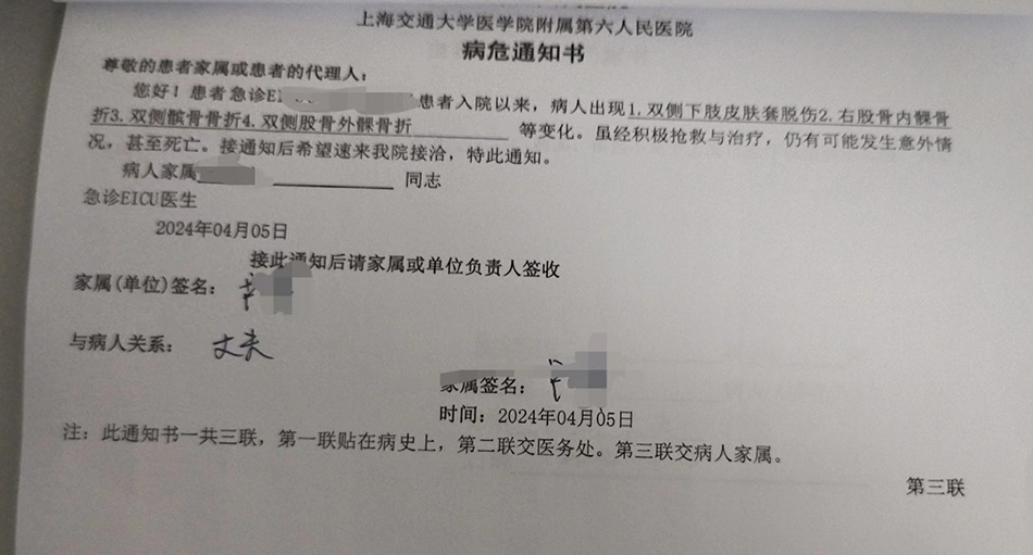 4月5日,医院下达病危通知书,表明患者出现双侧下肢皮肤套脱伤、右股骨内髁骨折、双侧髌骨骨折、双侧股骨外髁骨折等情况。虽经积极抢救与治疗,仍有可能发生意外情况,甚至死亡。