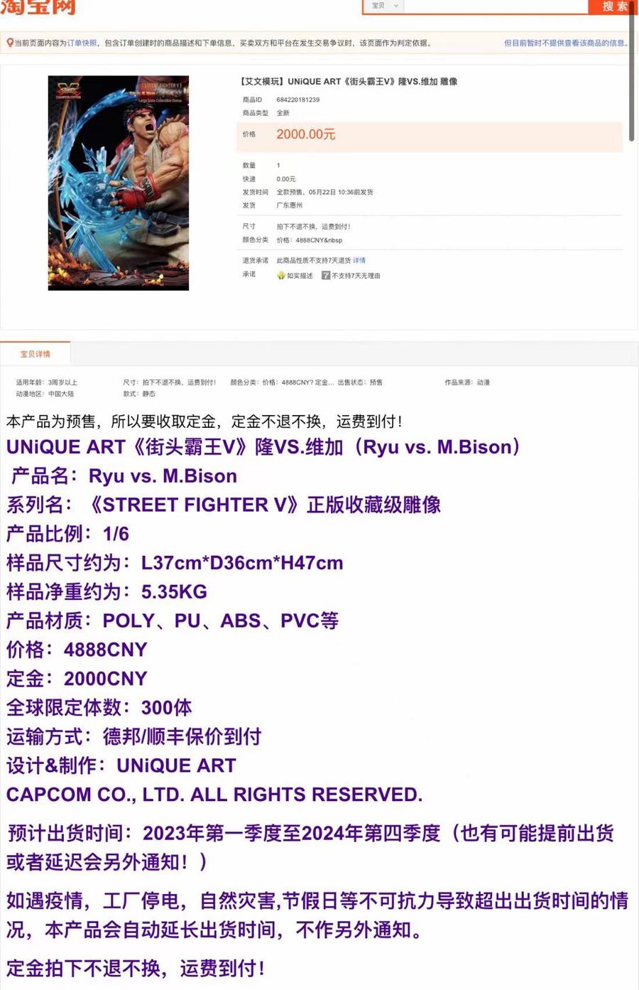 2023年1月,臧先生在淘宝平台的“艾文模玩”商铺看中了一尊全球限量300尊的模玩雕像。根据介绍,该尊模玩雕像属于预售发行产品,顾客下单时需先支付2000元定金,待制作周期完成后,商铺发货前再补足尾款2888元。