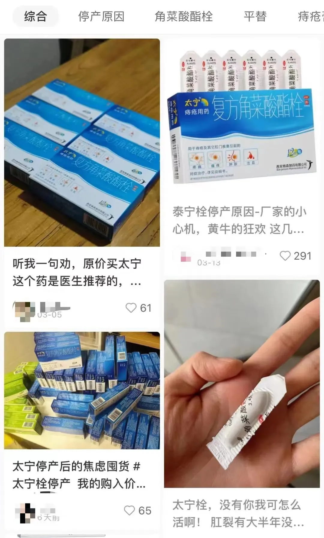 “太宁栓,没有你我可怎么活?”一位安徽的网友“清清”表示,自己是一位肛裂患者,“大半年没犯过(病)了,上个月底上完厕所觉得很痛,就立马想着买盒太宁栓回来用用,没想到找了一圈都没有。”