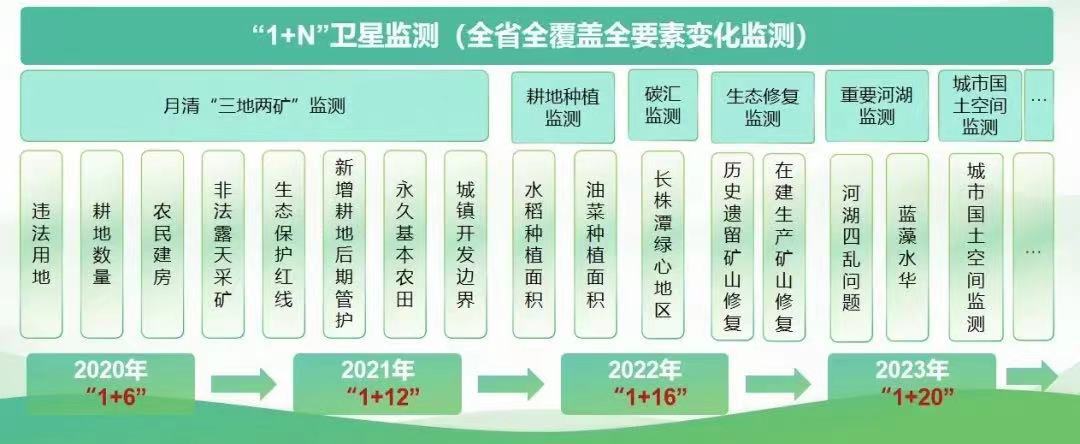 按照“1+N”思路,聚焦自然资源管理、生态文明建设和经济社会高质量发展的需求,不断拓展监测内容,已形成“1+20”监测格局,涵盖流出耕地、违法违规用地、生态保护红线、土地批后监管、矿业秩序监管、矿业绿色发展、耕地使用(含水稻与油菜)等自然资源工作,助力全省自然资源治理能力大幅提升,管理秩序持续向好。